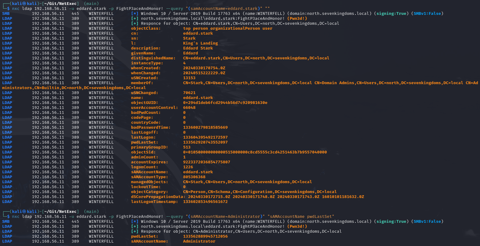 nxc ldap <ip> -u username -p password --query "(sAMAccountName=Administrator)" "sAMAccountName objectClass pwdLastSet"